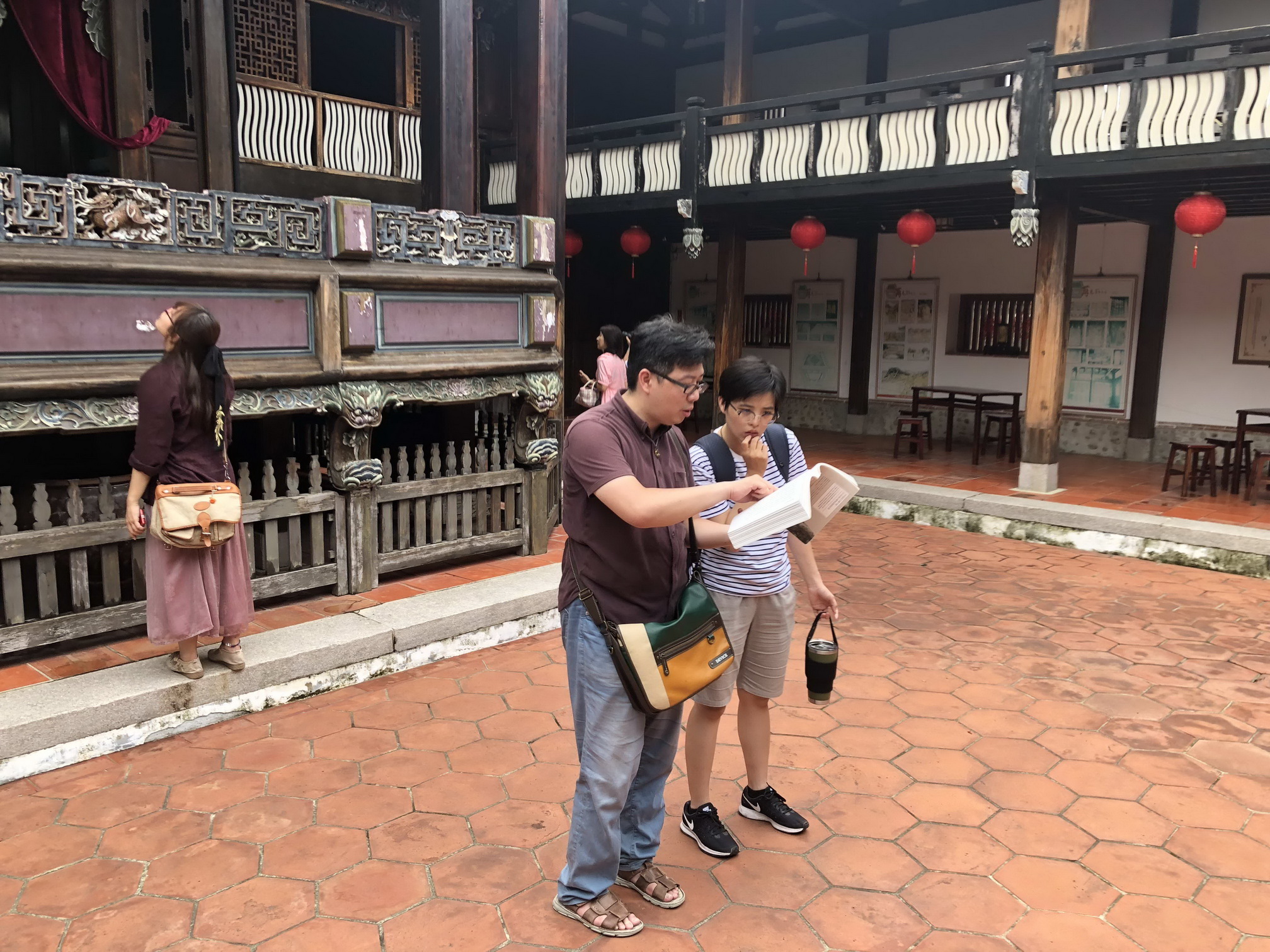 2018年楊双子與小說家瀟湘神在霧峰林家大花廳比對佐藤春夫《殖民地之旅》文字記載(曲辰拍攝)