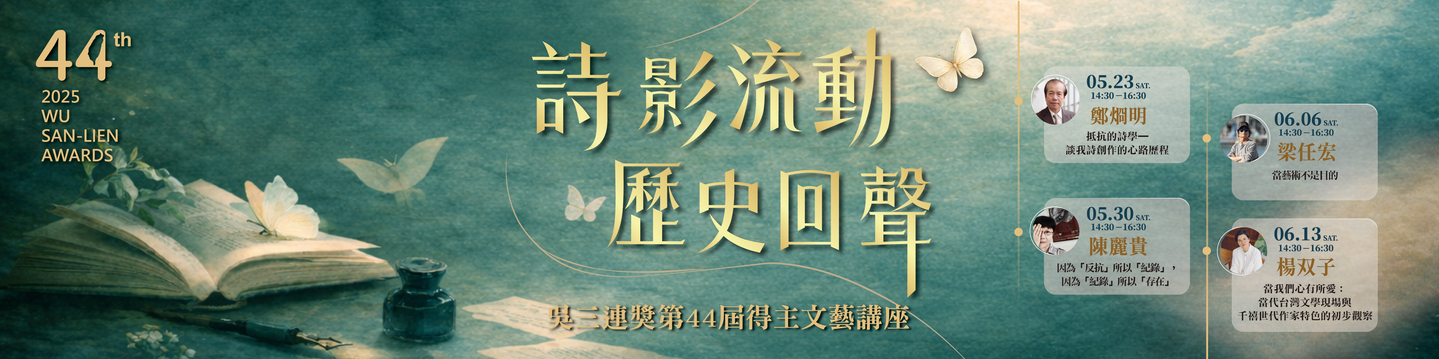 簡介:本屆得主文藝講座與國立臺灣文學館合作,於「臺灣文學糧倉」辦理,並以「詩影流動・歷史回聲」為主題,特別邀請 2025 年底榮獲第 44 屆吳三連獎的四位得主——文學獎新詩類鄭烱明、小說類楊双子,以及藝術獎影像類陳麗貴、雕塑類梁任宏,與大眾進行對談交流。期盼透過四位得主分享其創作歷程與長年累積的藝術經驗,展現其生命書寫與創作實踐,進而呈現文學與藝術如何在臺灣文化環境中持續滋養與生成,並引領大眾深化對臺灣文化藝術的理解與認同。地點:臺灣文學糧倉「文學跨域舞台」(臺北市中正區杭州北路26號旁)